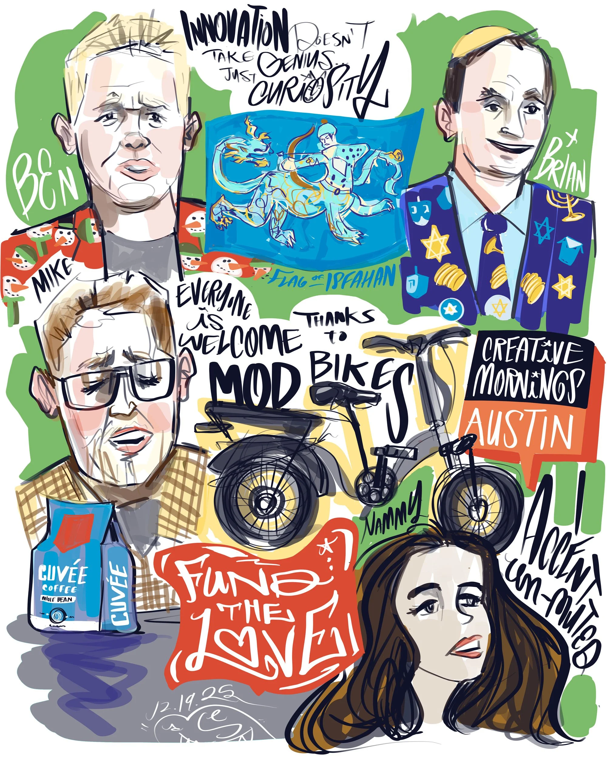 To help celebrate the 10th Anniversary of Creative Mornings Austin at their birthday party, I created a group mural experience to celebrate some of my favorite moments in #CMATX history! Since I have been sketching pretty much since the beginning it was tough pulling out my favorite details, but tried to highlight some of the frequent contributors, pivotal moments as well as my personal favorites. Included of course are organizers Ben Thomas, Ann Blocker and Brian Thompson, as well as my fellow documenters, Manny Panda and Marty Robbins, and of course our champions of caffeination, CUVEE Coffee. I included speakers such as China Smith, James Victore, David Ansel, Professor Dumpster (aka Jeff Smith), Chas Moore, and Laurie Frick. I also included some of our amazing musical guests (who generally played the earliest morning sets of their careers with us) like Nick and Paige and Henry Invisble—also CMATX music bookers for a while—Graham Reynolds and Mama Duke.