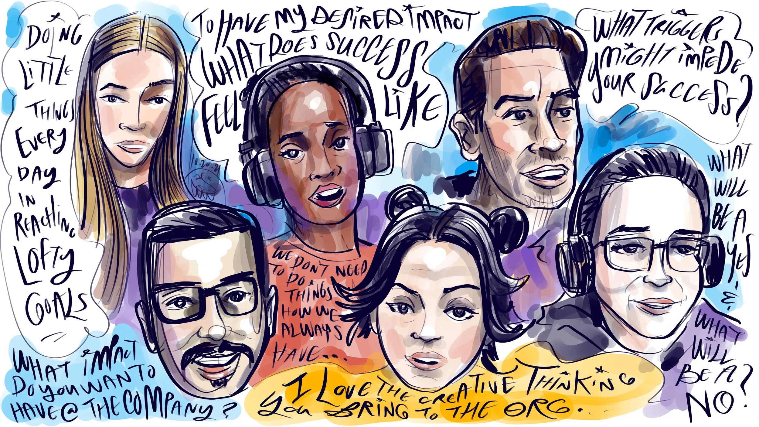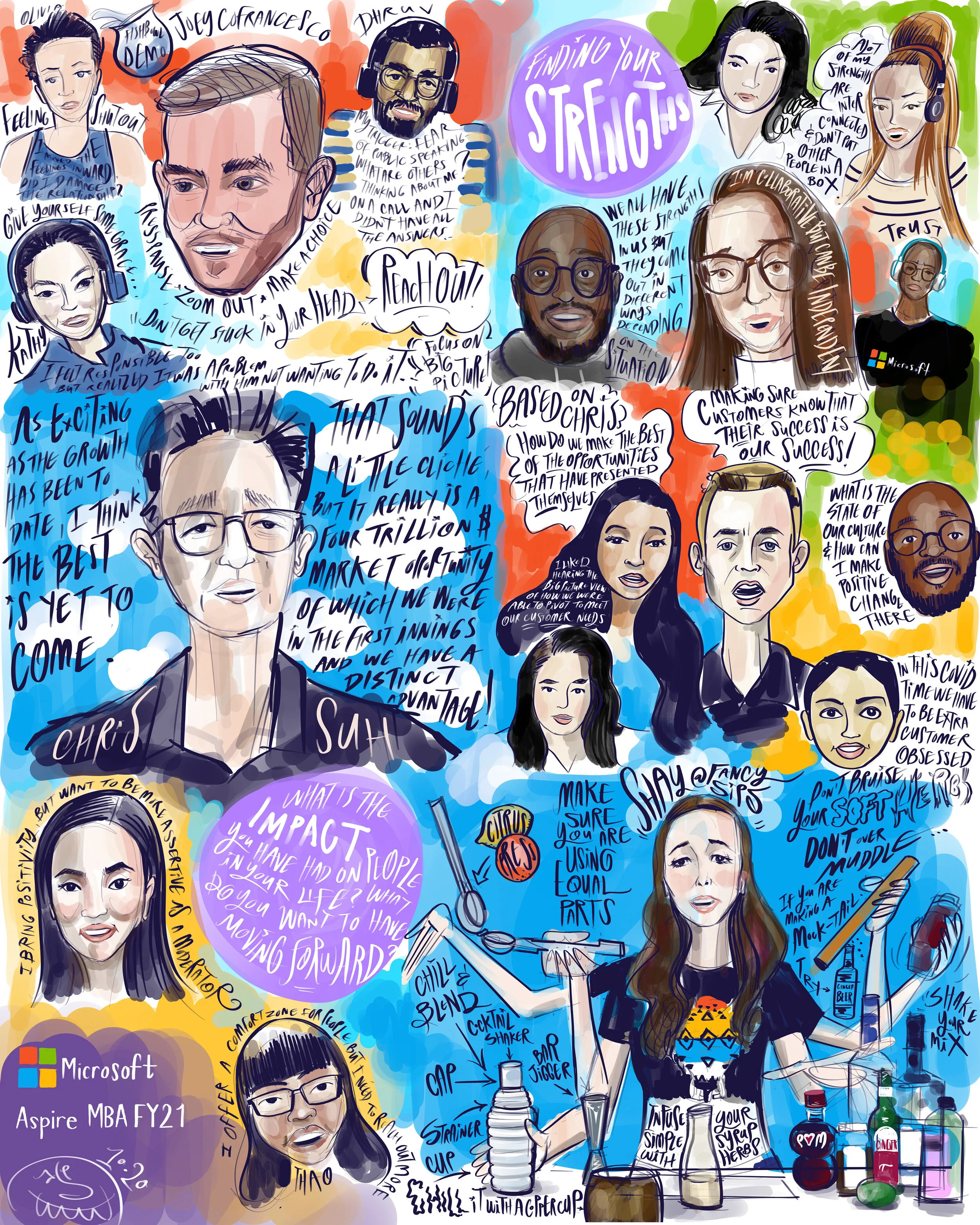 We have been really excited about our partnership over the last couple of years with Microsoft covering their events and running a workshop or two. We began by live painting a Microsoft Aspire event February 20th, 2020 in Redmond. Then all the sudden the world turned upside down but they adapted to connecting virtually, and we came along for the ride. Since then we have moved virtual, capturing their events—chock full of compelling speakers from within the organization as well as inspiring guests from the outside—and running creative workshops on the Microsoft Teams remote platform.